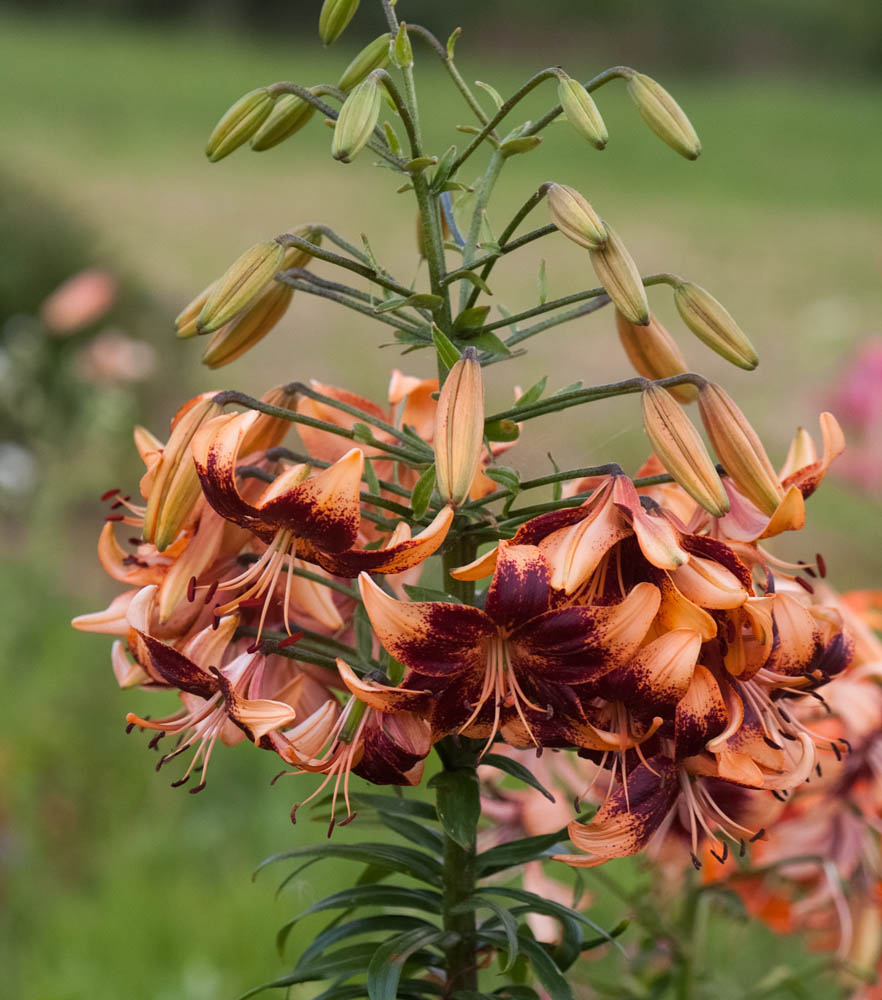Uz leju vērsti, oranži ziedi ar tumšu Tango punktējumu, izkārtoti bagātīgā, piramidālā ziedkopā.