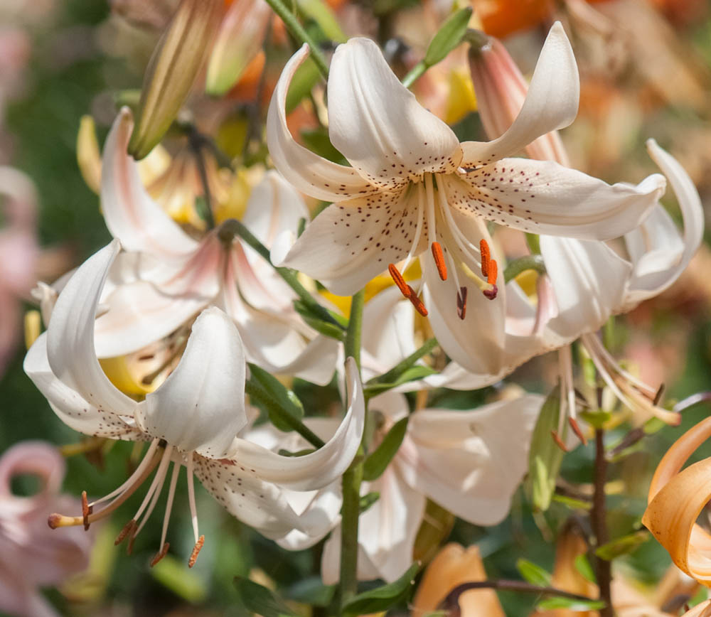 Krēmbalti, nokareni ziedi ar sīku punktojumu, augstums 90 cm.