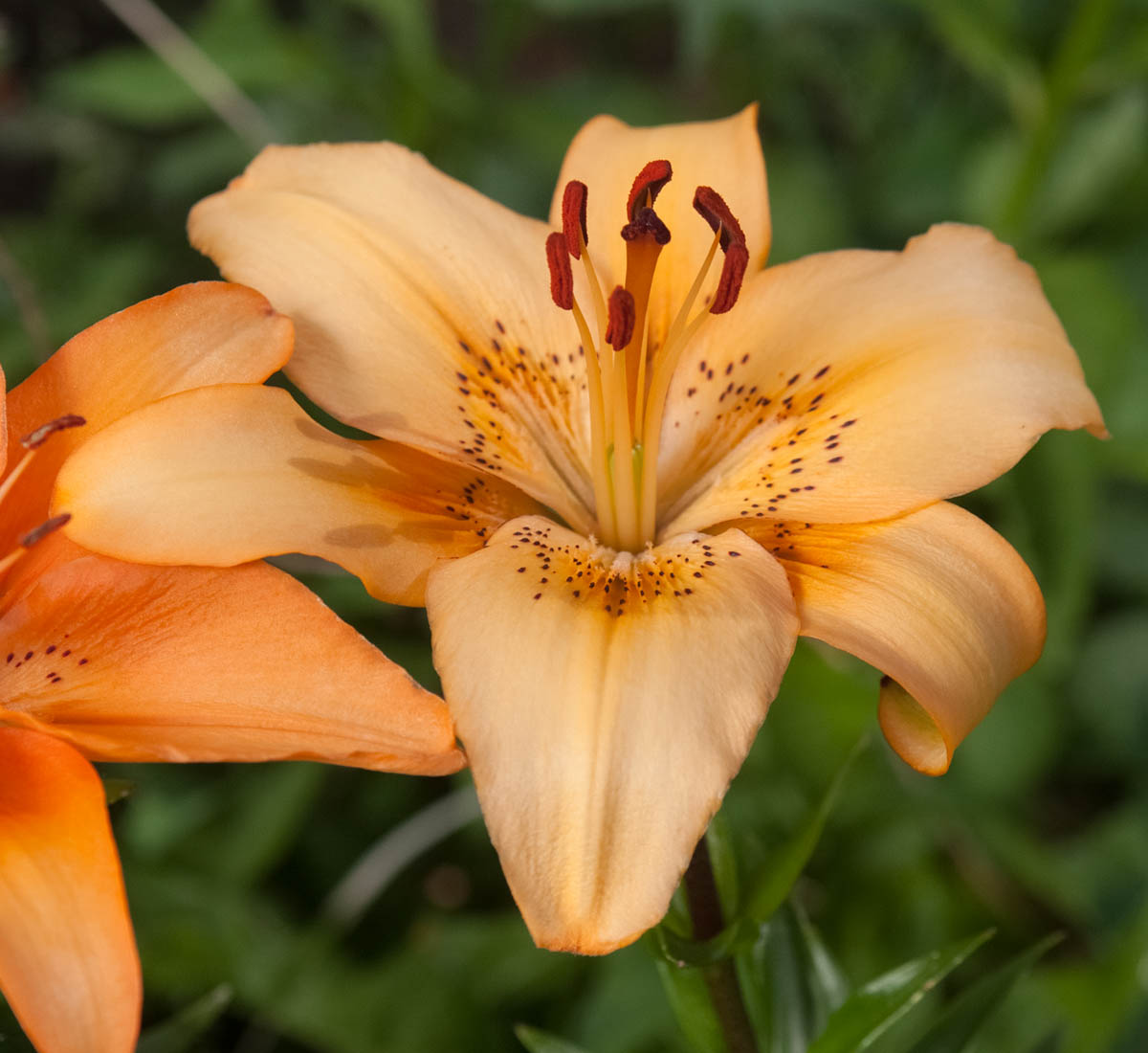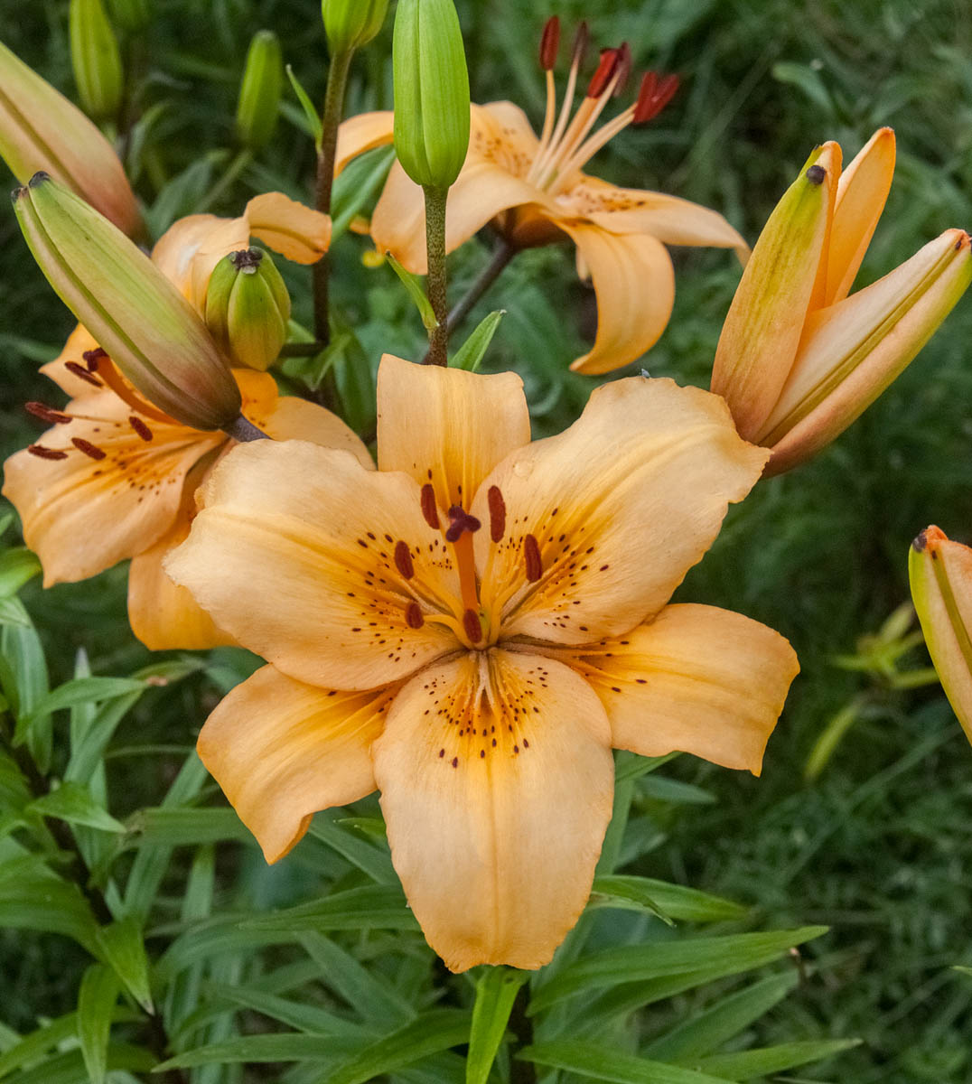 Gaiši aprikozu krāsas ziedi ar košāku aprikozu oranžu šautriņu ziedlapu centrā un nedaudz punktējumu. Augstums 80 cm.