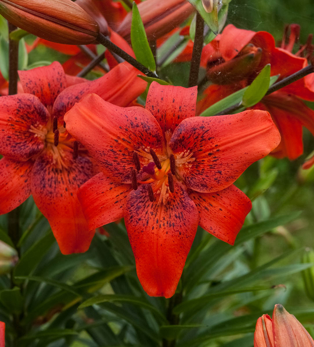 Koši sarkani, iesāņus vērsti ziedi ar vieglu Tango zīmējumu un punktiņiem.