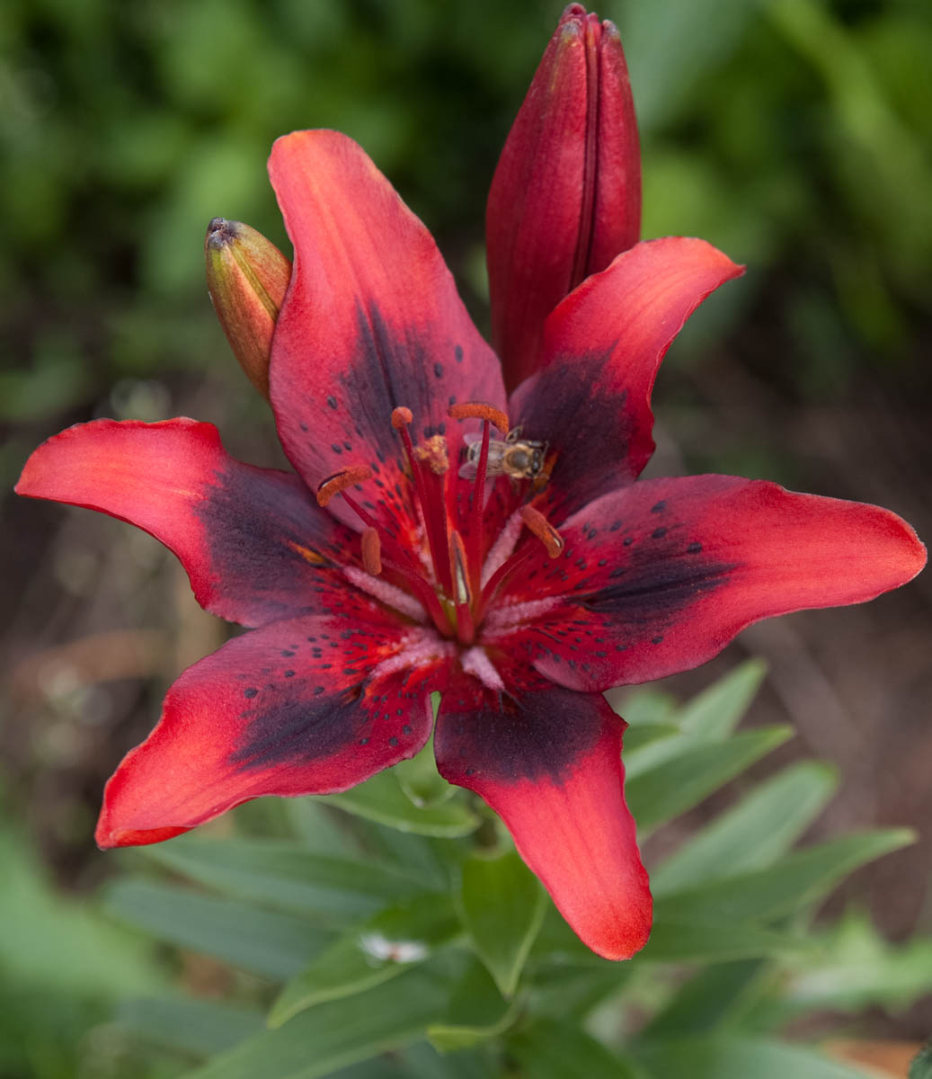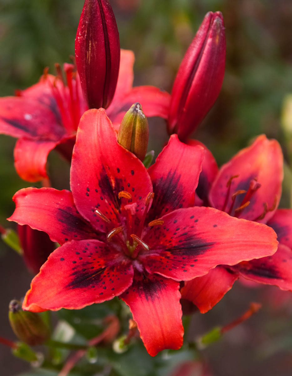 Tumši sarkani ziedi ar melnu Brašmark zīmējumu ziedlapu centrā.