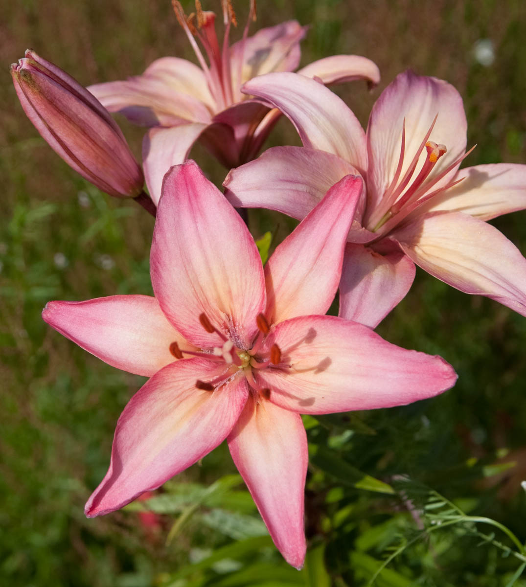 Pasteļrozā, augšupvērsti ziedi ar tumšāk rozā ziedlapu apmalēm. Tetraploīda.