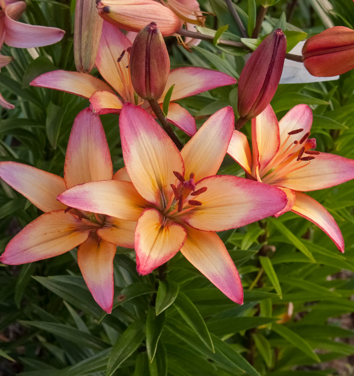 Zvaigžņveida ziedi ar aprikozu oranžu centru un rozā ziedlapu galiem, augsums 80 cm, tetraploīda.