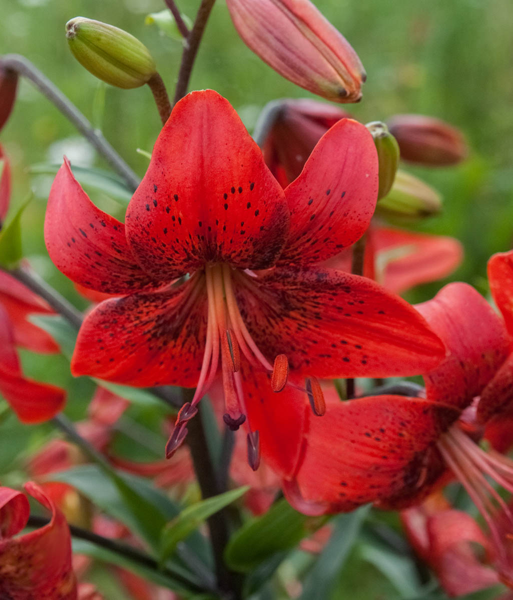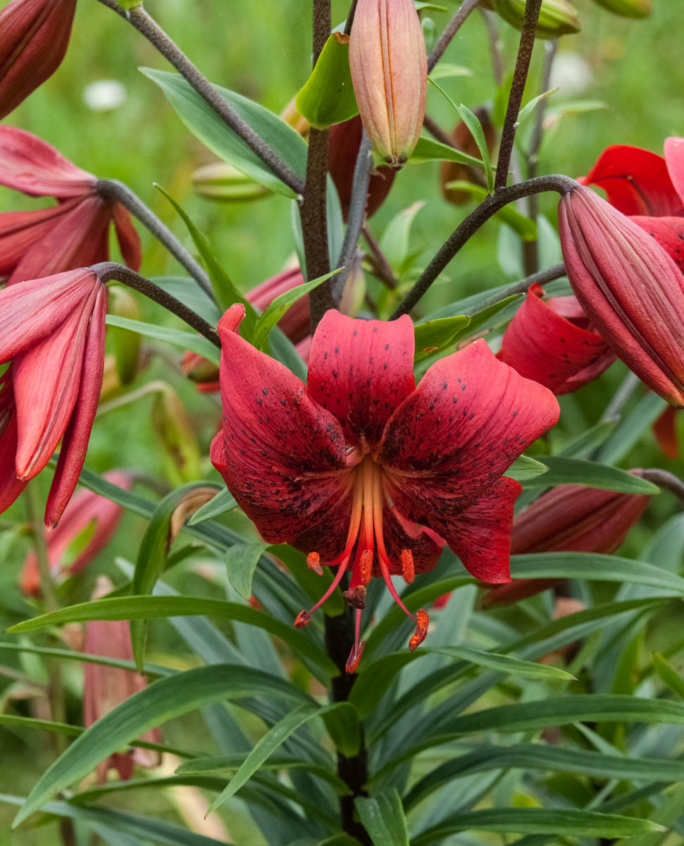 Sarkani lejupvērsti ziedi ar atliektām ziedlapām, vieglu Tango zīmējumu un melniem punktiem.