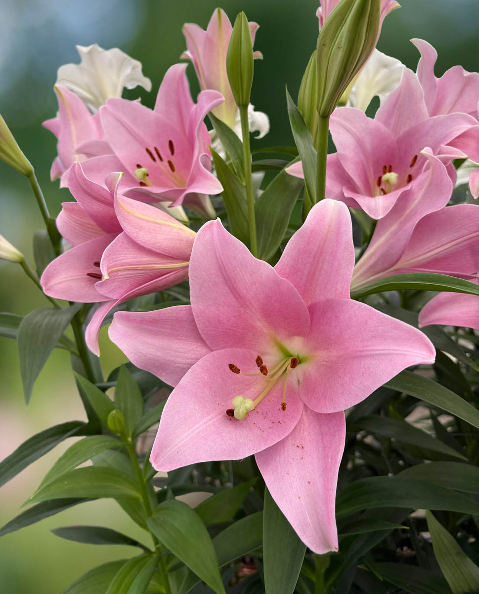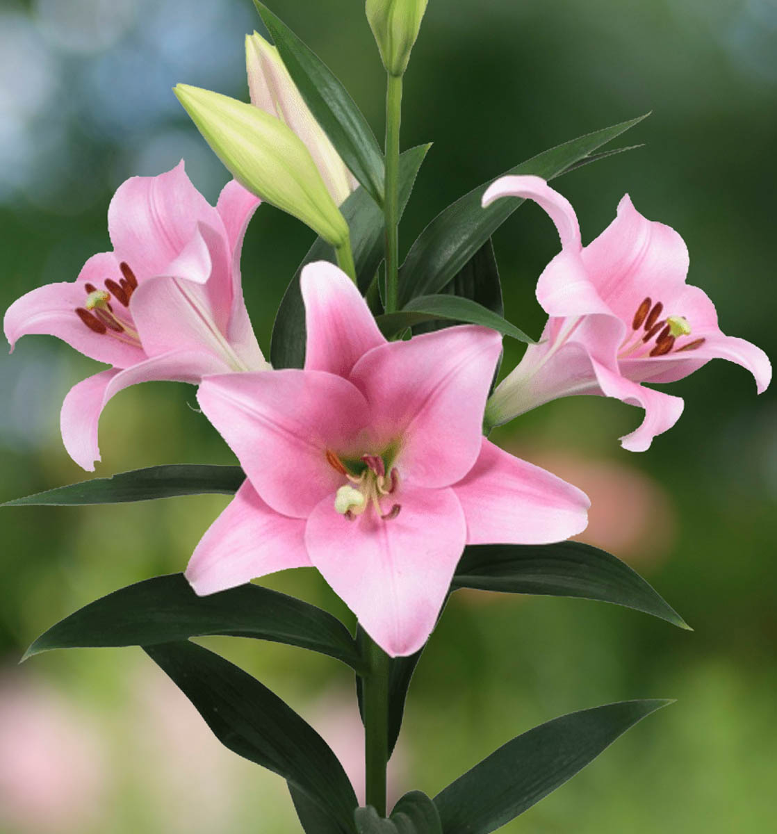 Gaiši rozā trompetveida ziedi. Augstums 130 - 150 cm.