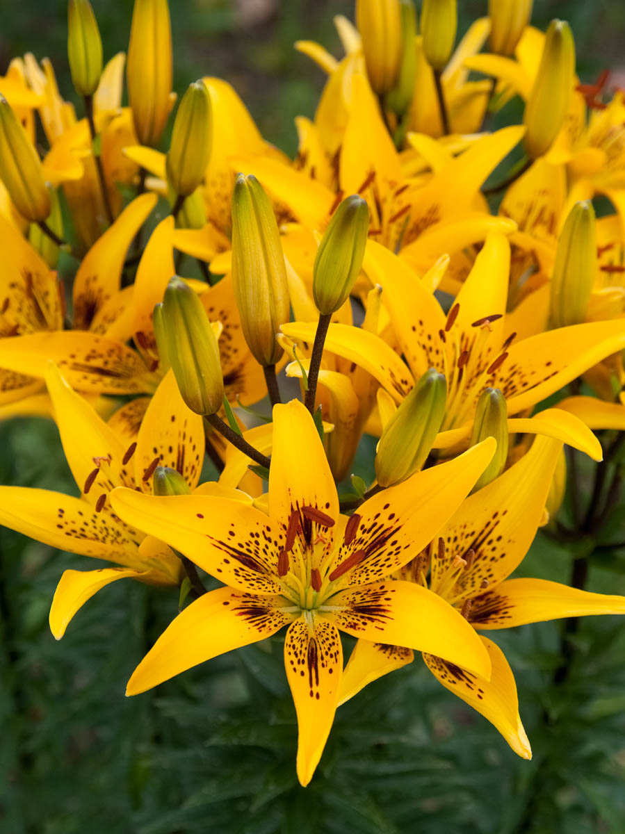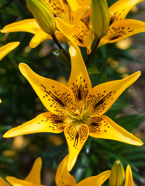Āzijas lilija - 1a/b - G. Grants. Lieli zvaigžņveida ziedi - olu dzelteni ar izteiktu melnu svītrojumu un punktējumu un nelielu "brašmarku" ziedlapu vidū. Ir sekundārie pumpuri. Tumšas lapas, tumši ziedkāti, zied jūlija vidū. Ziedkopā 18 ziedi. Augstums 90 - 100 cm, zieda diametrs 18 cm. |