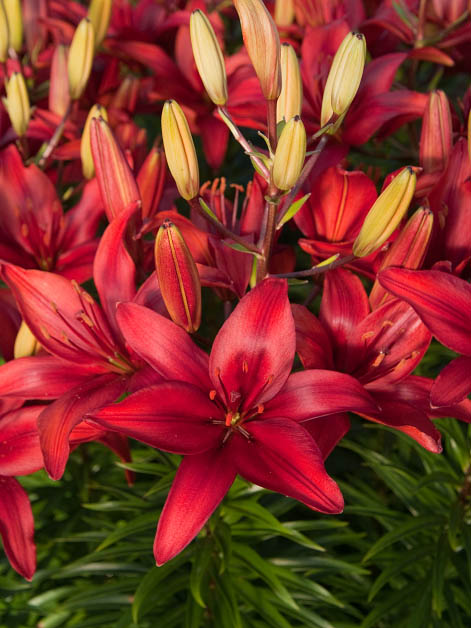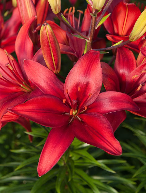 Āzijas lilija - G.Grants Koši sarkani, lieli ziedi simetriskās ziedkopās. Ziedlapas ar satīna spīdumu. Augstums 100 cm, zieda diametrs 17 cm, ziedkopā 12 - 15 ziedi.