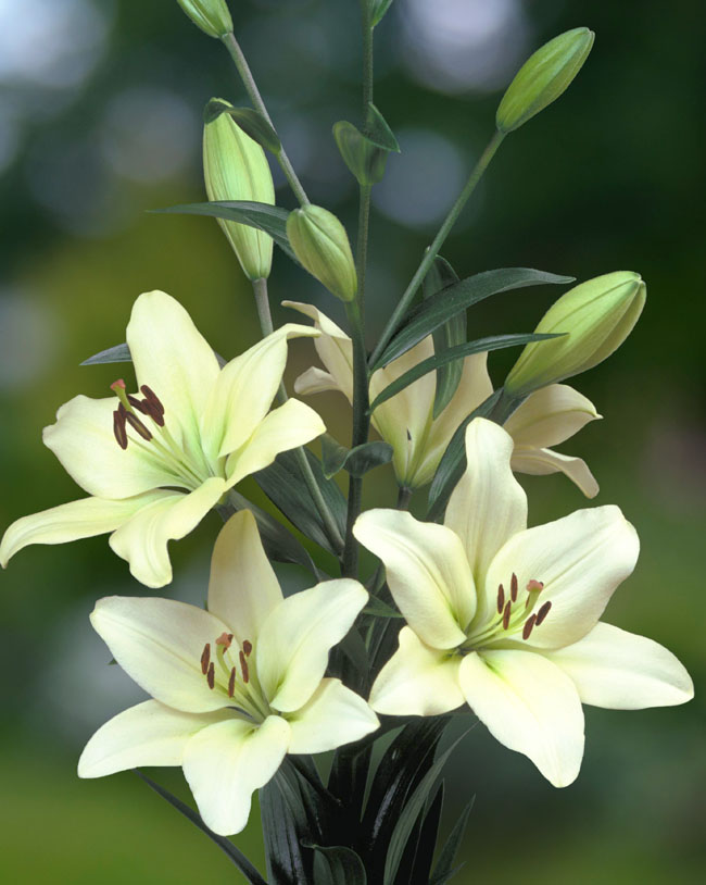 Plaukstot krēmzaļgani ziedi, vēlāk balti. Augstums 100 - 110 cm