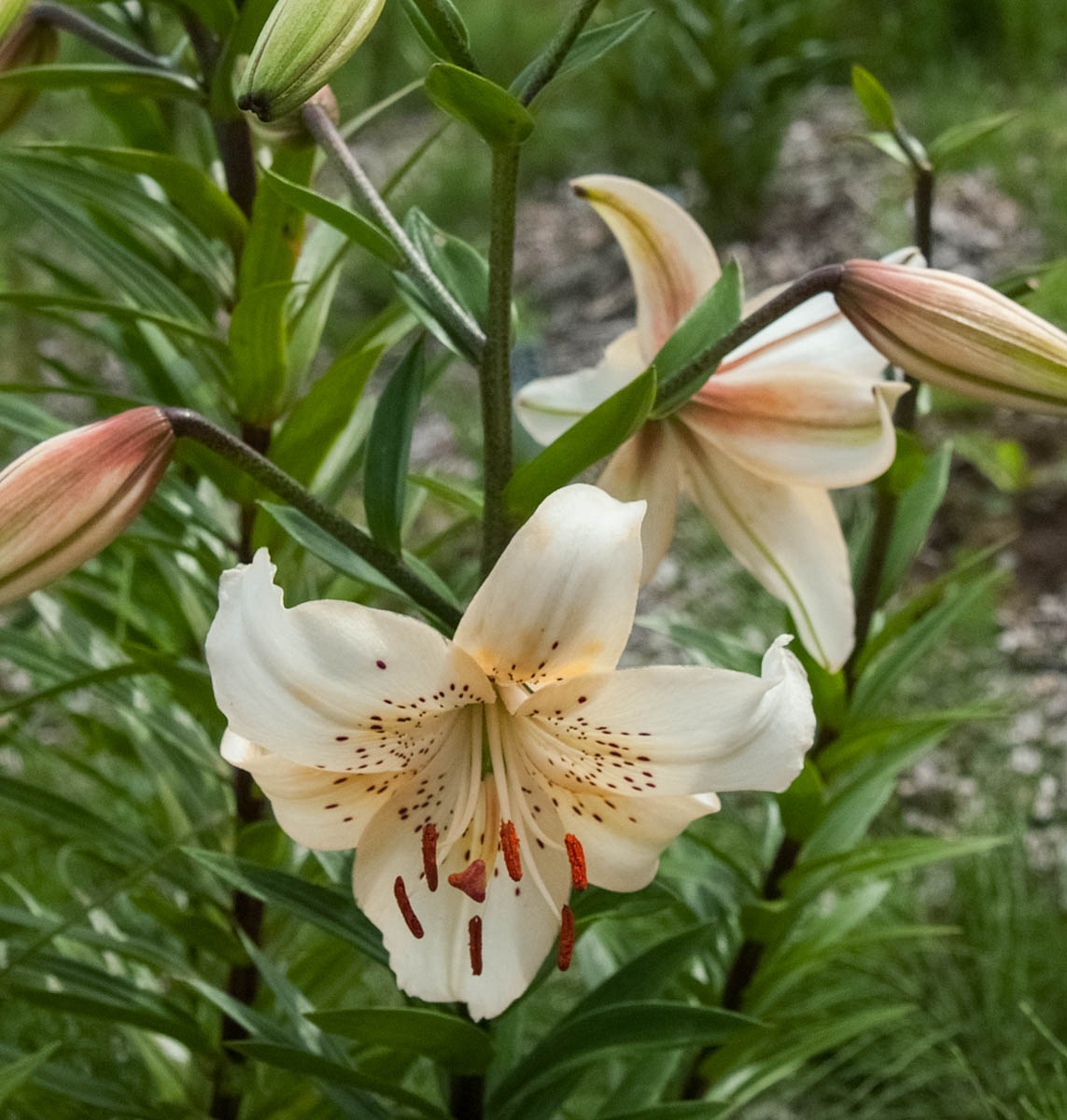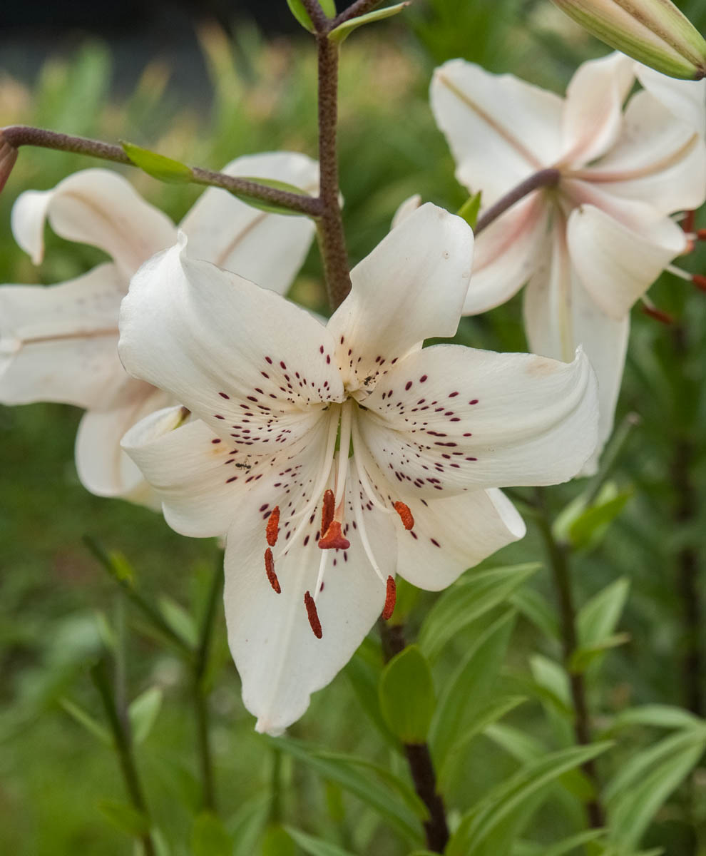 Iesāņus/uz leju vērsti balti ziedi ar krēmīgu centru un dekoratīviem, tumšiem punktiņiem centrā. Augums ap 1 m. Tetraploīda.
