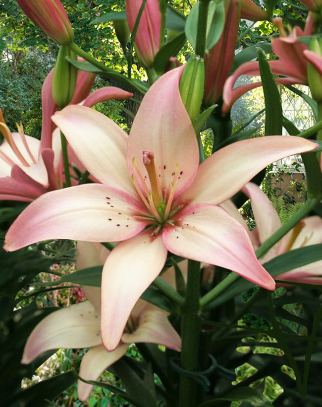 Krēmbalti ziedi ar rožainiem ziedlapu galiem. Reducētas putekšnīcas - nesmērē drēbes. Augums 80 - 90 cm, 10 ziedi.