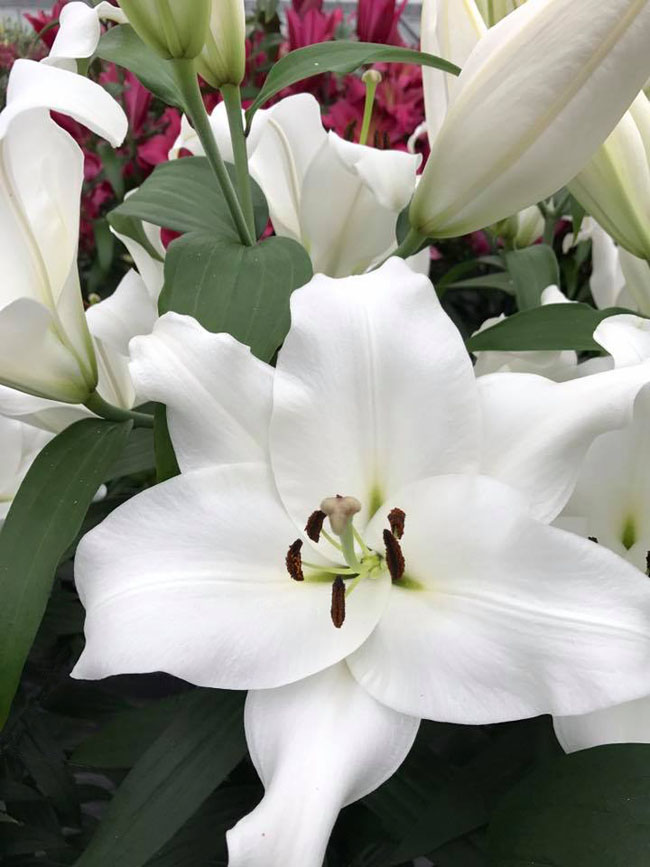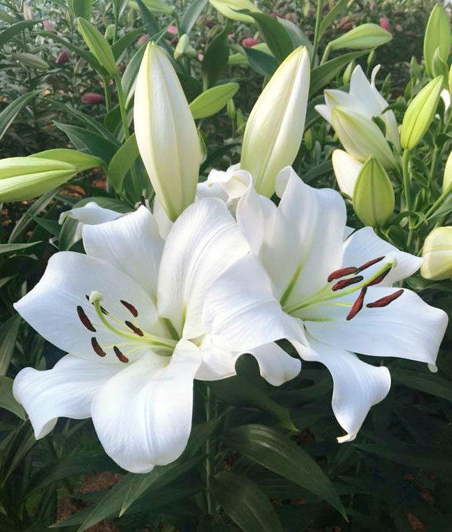 Lieli, cēli balti ziedi. Smaržo. Augstums 120 - 130 cm.