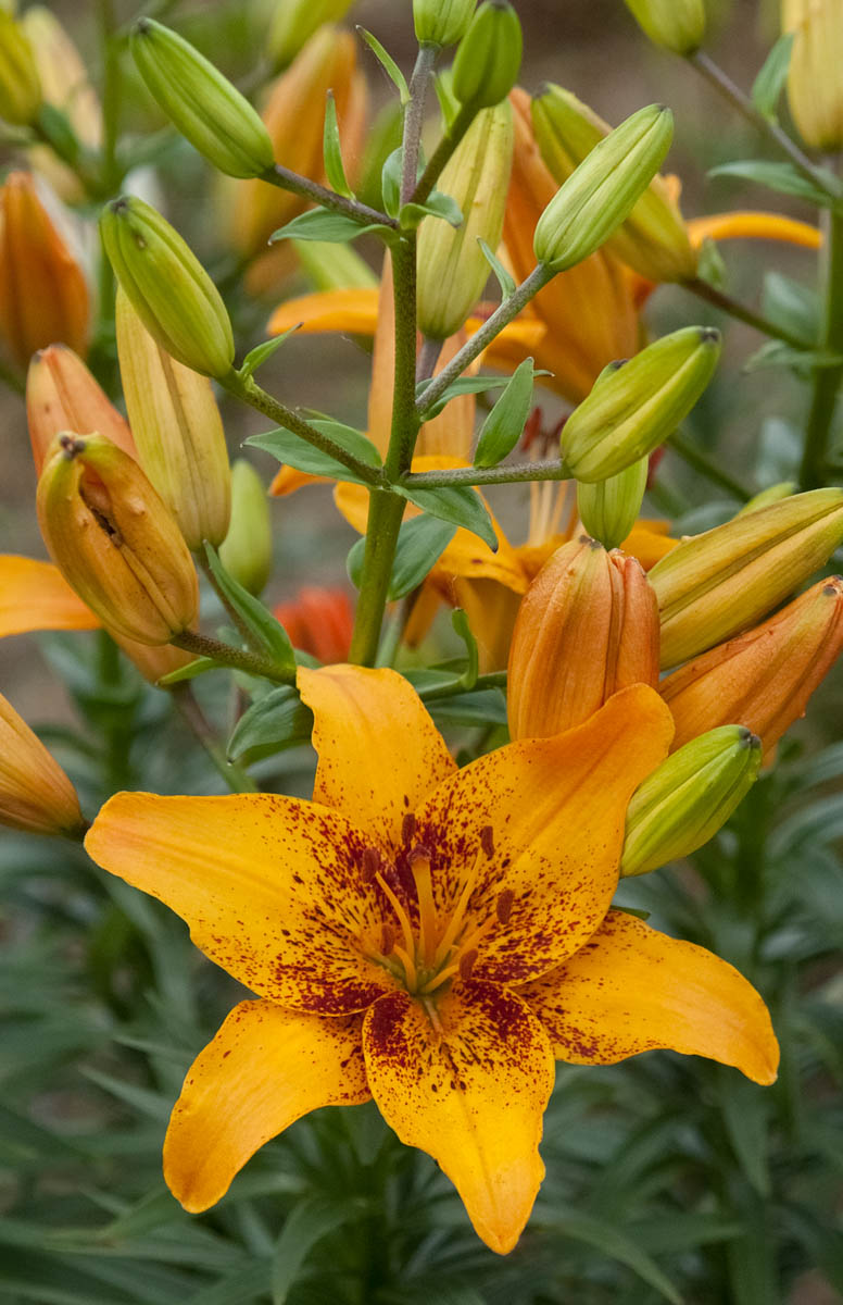 Āzijas lilija - G.Grants Medaini dzelteni, lieli ziedi ar tumši brūnu tango punktējumu centrā. Veido bagātīgas, piramidālas ziedkopas. Augstums - 100-120 cm. Tetraploīda. | |